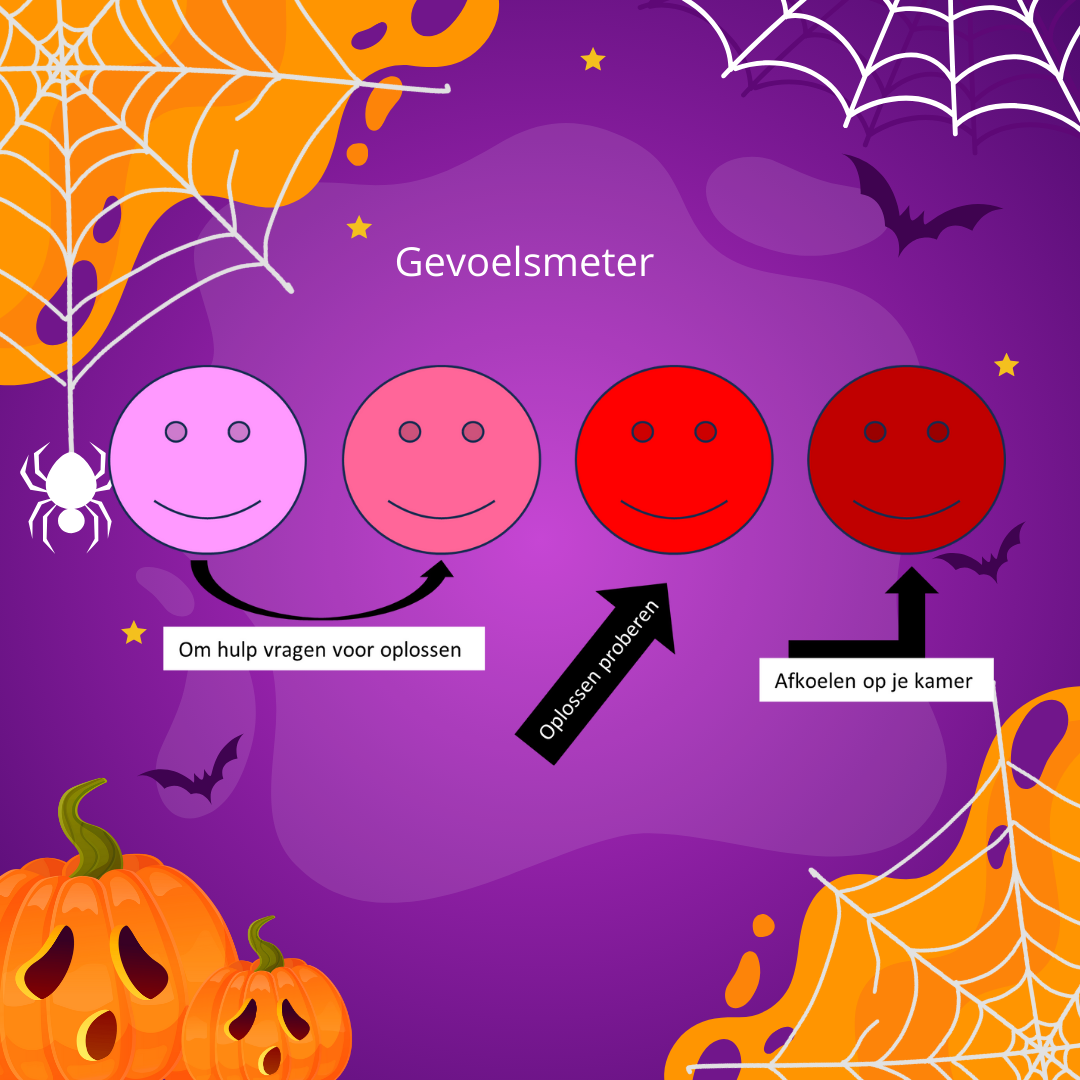 Tip: Voor mijn dochter werkte het geweldig om te zeggen: “Als je je in donkerrood voelt, ga dan naar je kamer, doe de gordijnen dicht, rolluiken naar beneden, deur dicht, zet een lampje onder je bed aan en pak een lekker boek. Niemand mag je storen.” Ze vond het geweldig om even wat tijd voor zichzelf te hebben.